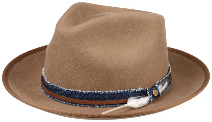 • Sein klassisch anmutender Charme macht die Fedora-Form zum ansprechenden Blickfang. Das recht kantige Design der Krone wird von dem nach oben geschlagenen kurzen Rand in Szene gesetzt. Zusammen ergeben die Elemente eine harmonische Erscheinung.
